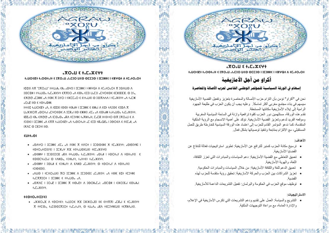 “أكراو” تدعو حزب الأصالة والمعاصرة إلى اتخاذ موقف قيادي وفعّال في دعم القضية الأمازيغية، وإستغلال موقعه الحكومي والبرلماني لتحقيق تأثير ملموس. من خلال التزامنا المشترك وتنسيق جهودنا مع الرؤية الملكية المتقدمة، يمكننا ضمان تطوير وتنفيذ سياسات تنهض بالقضية الأمازيغية وتدعم تكاملها في النسيج الوطني المغربي، وترسيخ قيم “تامغرابيت”.