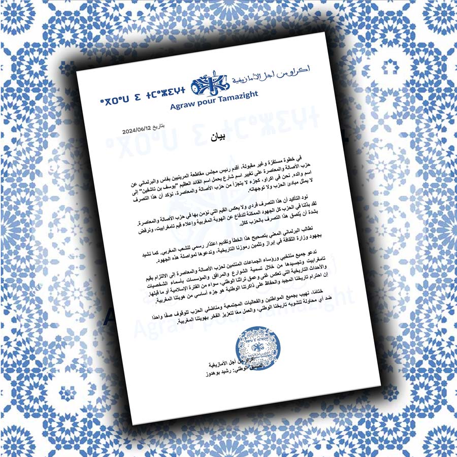 نود التأكيد أن هذا التصرف فردي ولا يعكس القيم التي نؤمن بها في حزب الأصالة والمعاصرة. لقد بذلنا في الحزب كل الجهود الممكنة للدفاع عن الهوية المغربية وإعلاء قيم تامغرابيت، ونرفض بشدة أن يُلصق هذا التصرف بالحزب ككل.
